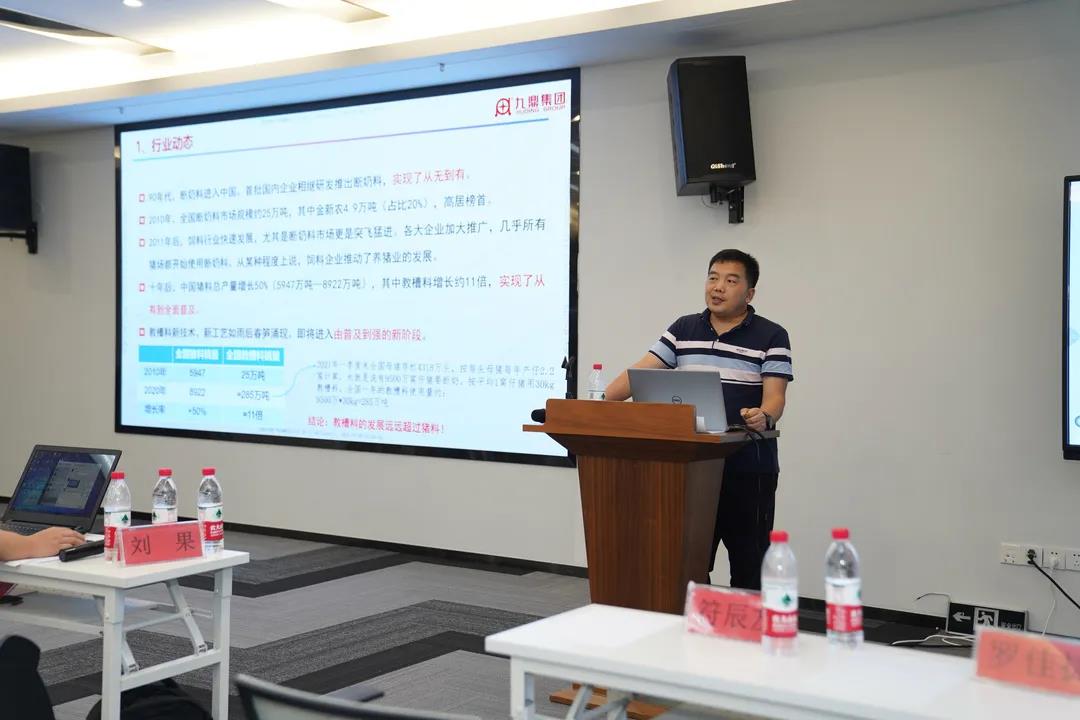 集團產品中心總經理羅佳捷講解了規(guī)模豬場飼料產品相關內容