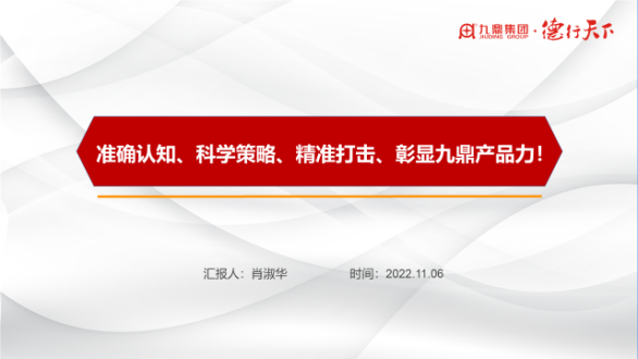 準(zhǔn)確認(rèn)知、科學(xué)策略、精準(zhǔn)打擊、彰顯九鼎產(chǎn)品力。2022年11月6日由人力行政中心組織九鼎產(chǎn)品力戰(zhàn)略宣貫會在集團(tuán)總部14樓會議室召開。集團(tuán)副總裁肖淑華帶領(lǐng)九鼎人立足行業(yè)制高點(diǎn),以深入和敏銳的視角來剖析九鼎的產(chǎn)品。